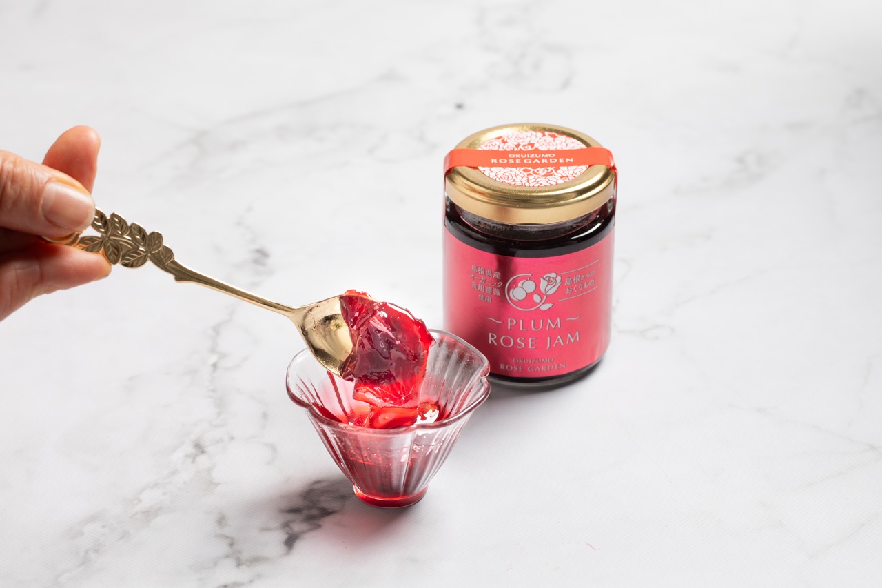 奥出雲薔薇園で生産する有機栽培の食用薔薇「さ姫」と、国産の梅を使用して作ったローズジャム。芳醇な薔薇の香りと梅のまろやかな酸味の相性がよく、薔薇の花びらの食感は、「薔薇そのもの」を食べている贅沢さと満足感を味わえます。